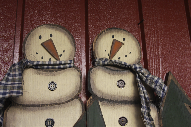 Jamen var det fleire snømenn på trappa og. I tillegg til desse to i tre er det snømenn på vintergardinet på det litle vindauget ut mot trappa.