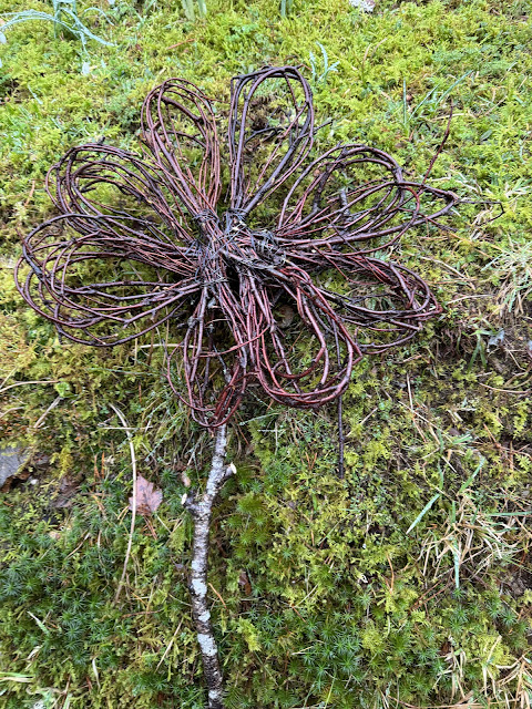 Me hadde klippa og beskjæret trollhasselen/vrihasselen vår. Laga to store kransar av trollhasselen, surra den godt med tynn ståltråd til den fekk ei rund og stabil form. Den eine hengde på husveggen den andre bruker eg til borddekorasjon ute på hagebordet.